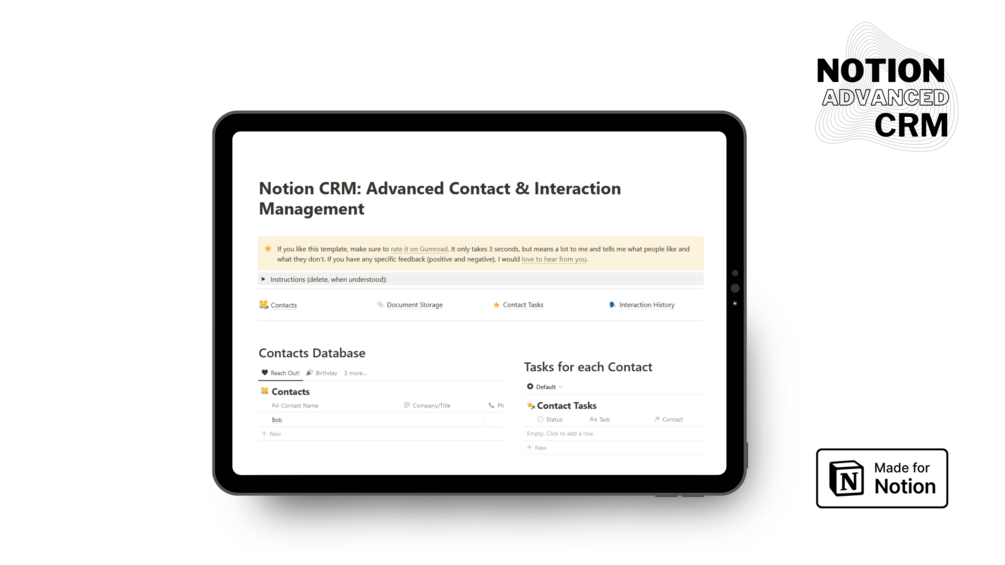 Gain access to the Notion Advanced Contact & Interaction Manager now. Never forget to reach out to friends and professional contacts anymore and keep track of contact relevant resources and tasks..