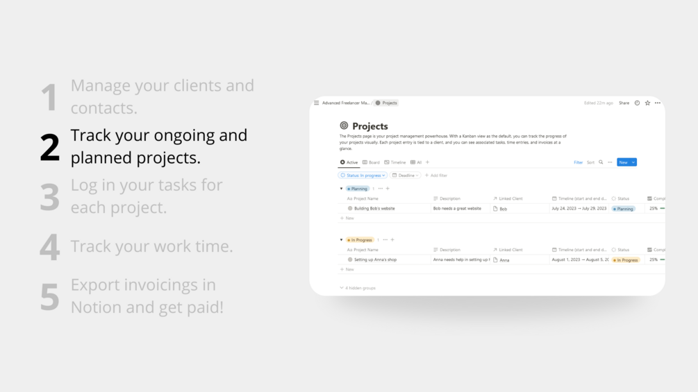 Gain access to the Notion Freelancer Dashboard Pro. Stream-line your freelancing business and save time on admin work.