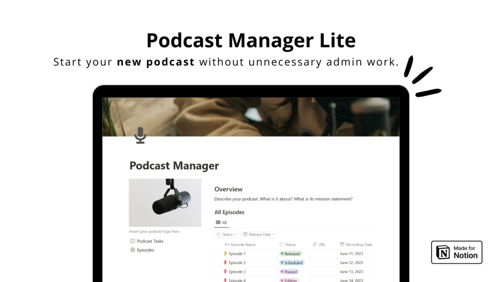 Here's how and what's included: build on Notion's project management capabilities to manage your podcast