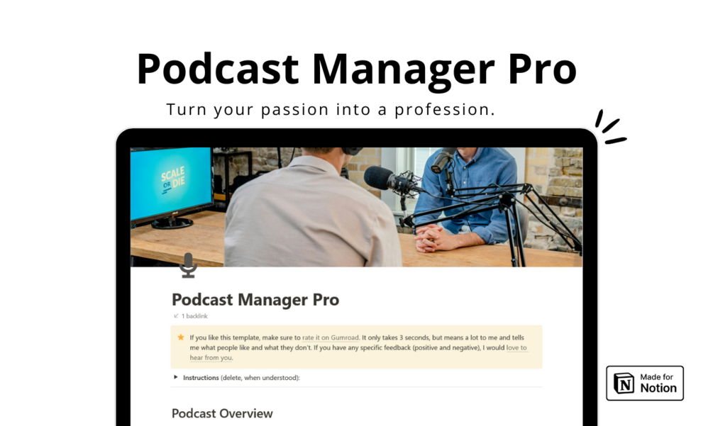An all-in-one Notion system, specifically built for Podcasters. It centralizes Episode, Guest and Task Management, and everything you need to reduce your admin work. For a complete summary of the features for which version, see: https://notionpodcastmanager.com/#features