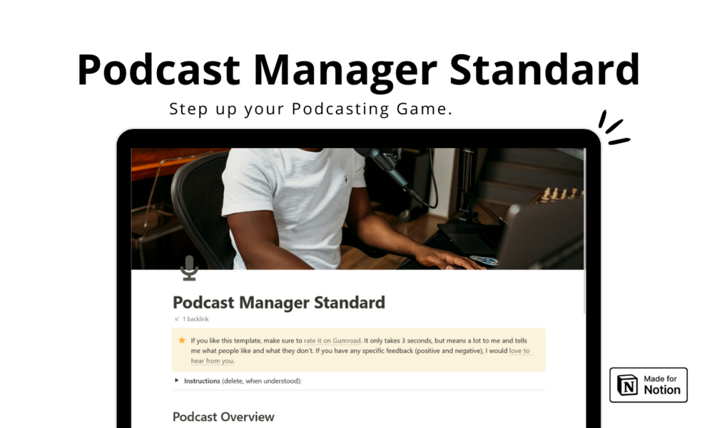 An all-in-one Notion system, specifically built for Podcasters. It centralizes Episode, Guest and Task Management, and everything you need to reduce your admin work. For a complete summary of the features for which version, see: https://notionpodcastmanager.com/#features